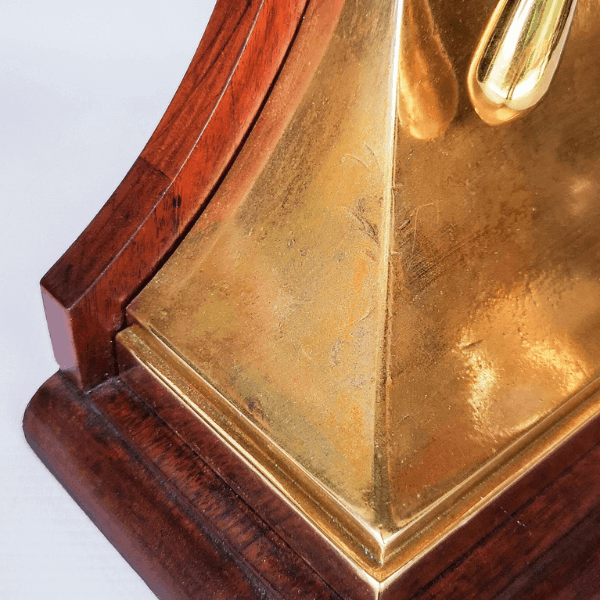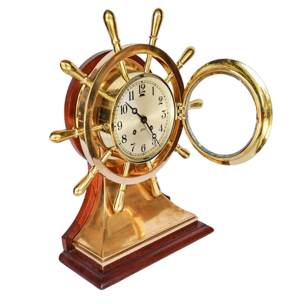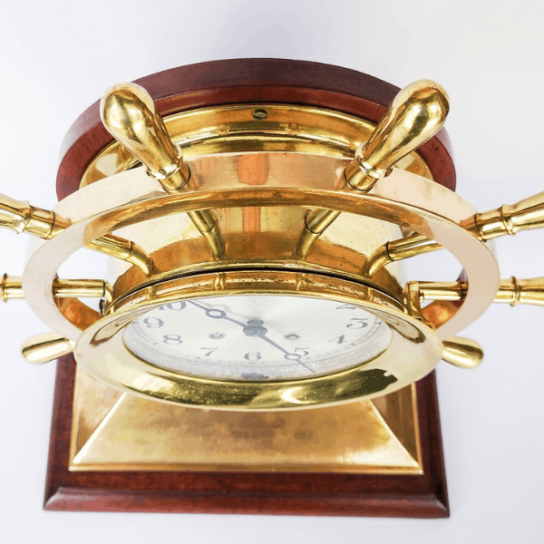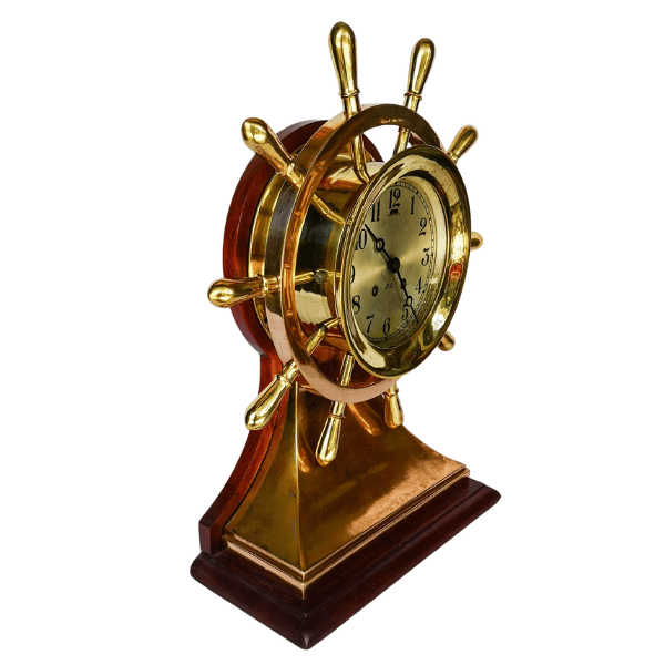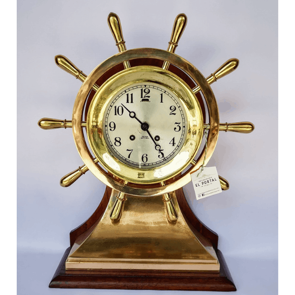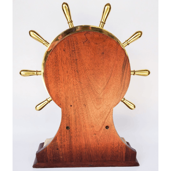 Reloj de mesa de estilo náutico, diseñado en forma de timón, elaborado en bronce y montado sobre base de madera. Incorpora mecanismo tipo Ships Bell, característico de la relojería marítima, y esfera con numeración arábiga protegida por puerta frontal de vidrio abatible.
