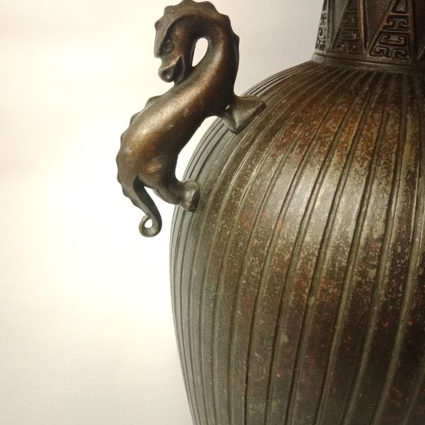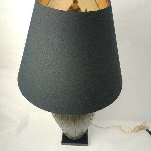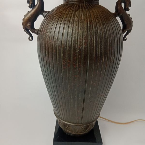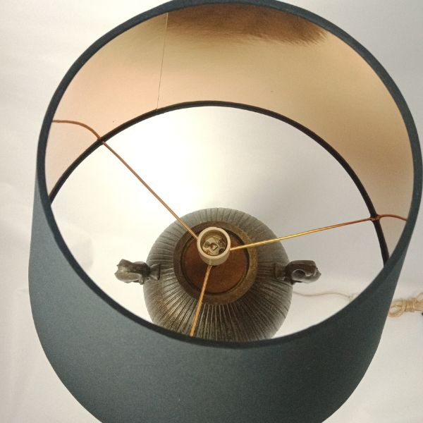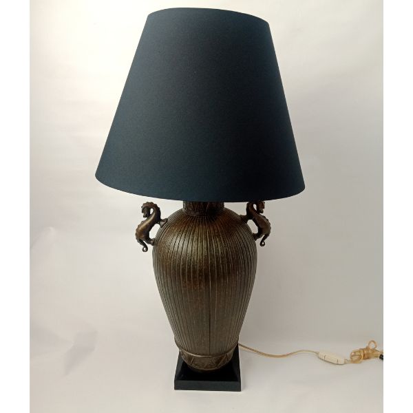 Esta lámpara de mesa destaca por su elegante reinterpretación del estilo oriental dentro del diseño decorativo del siglo XX. Su cuerpo tipo ánfora, con acanalado vertical y acabado envejecido en tonos bronce, evoca piezas ceremoniales de inspiración asiática, muy valoradas en el diseño mid-century.