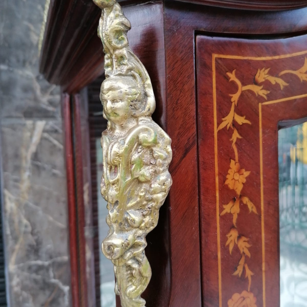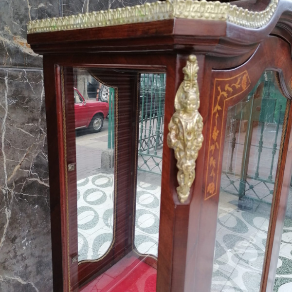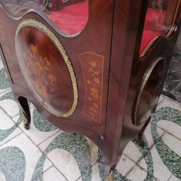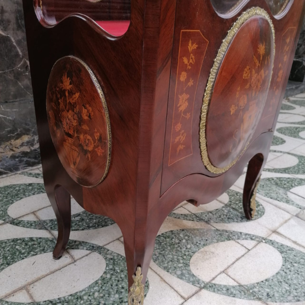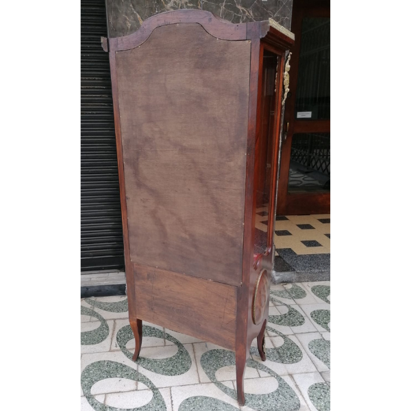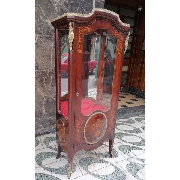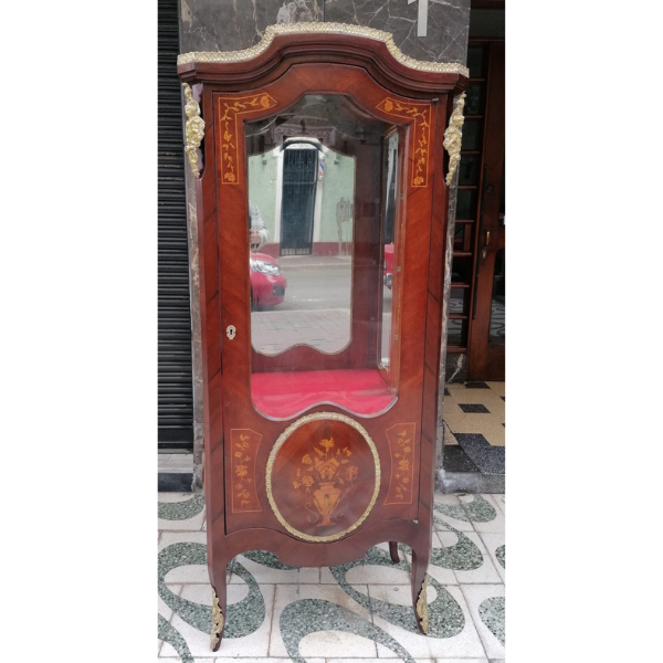 Vitrina Luis XV madera marqueteada con apliques de bronce, en su interior dos divisiones de vidrio.